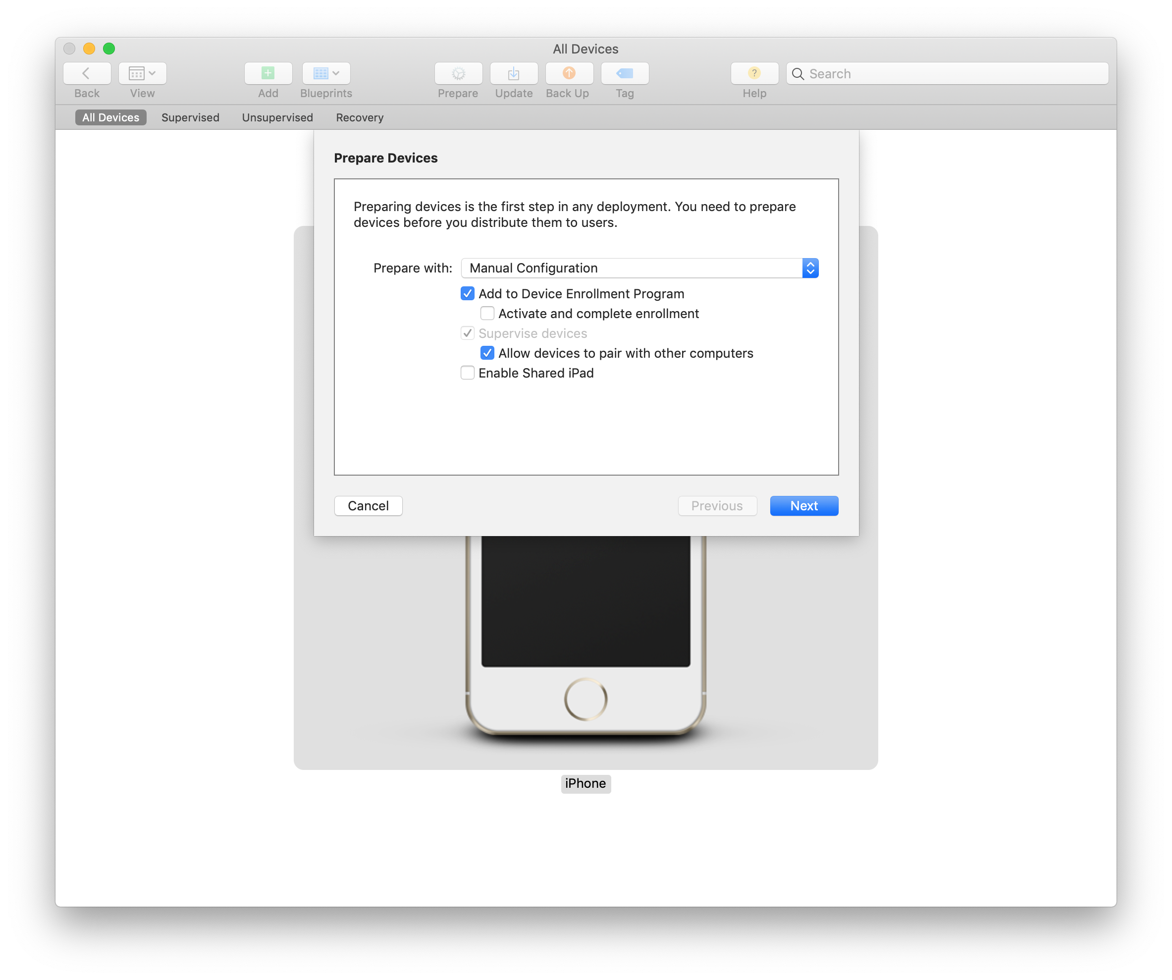 Note: at the time of writing this, the version of Apple Configurator used was 2.10. The layout and/or exact steps for this process may change slightly over time, but the concepts should be similar.