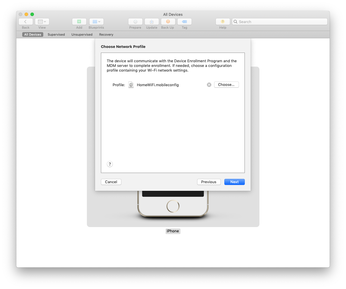10. Choose a network profile. This allows the device to connect to WiFi during the initial setup. If you haven't yet created a WiFi profile, click 'File', select 'New Profile', then create a new WiFi network profile via Apple Configurator.