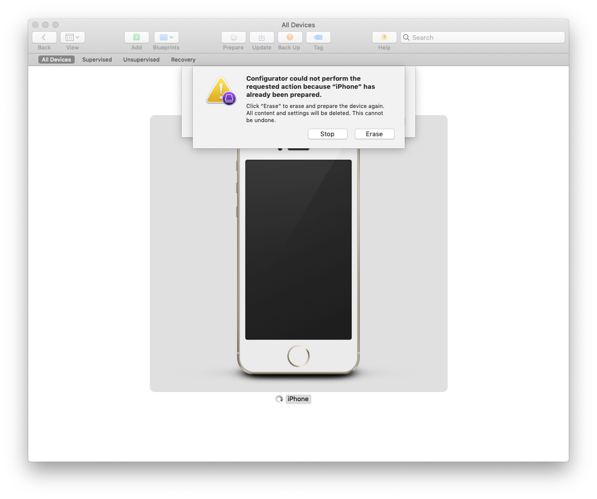 12. If your device has already been setup previously (meaning it is not brand new), you will need to erase the device to add it to ABM and enroll it in MDM. You will be prompted by Apple Configurator to erase it.