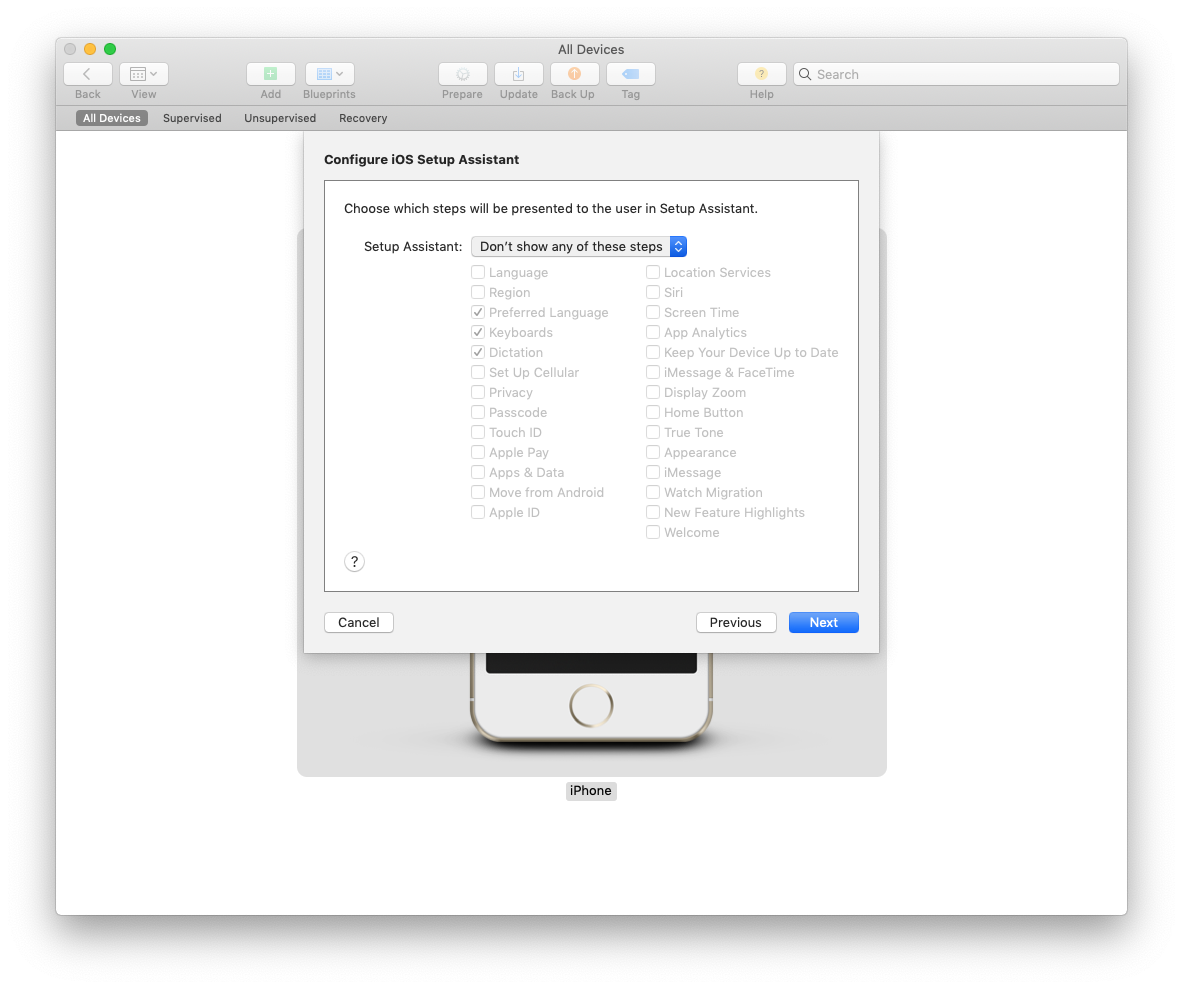 9. Configure Setup Assistant. On this step, select which setup screens you want to be shown to the user when setting up the device.